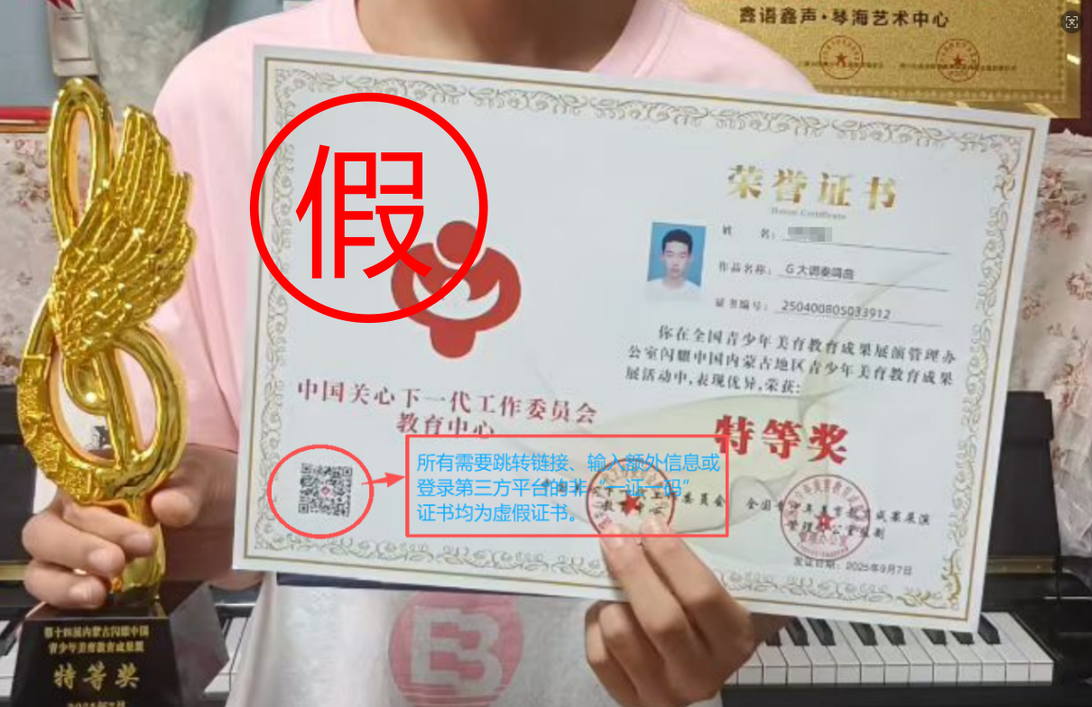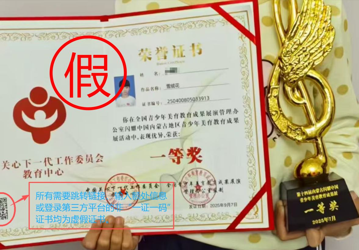 一、我办此前在系统化管理期间所发放的证书,均为“一证一码” 防伪版本,扫码无需输入任何信息即可查验参与者信息及活动真实性。凡非经此正规途径获取的证书,均为虚假证书,不具备任何效力与认可度。(真实版本证书附页)