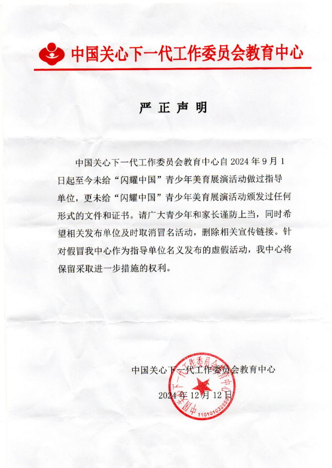 “闪耀中国青少年系列活动”因在2024年暑假组织严重混乱,中国关心下一代工作委员会教育中心经审慎研究后对其发布严正声明,同时,教育中心与该活动的组织单位签订解约协议。为妥善处理后续事宜、维护各方权益,我办随即对该活动实施全面系统化监管,监管期限至2025年9月30日。(中心声明附页)