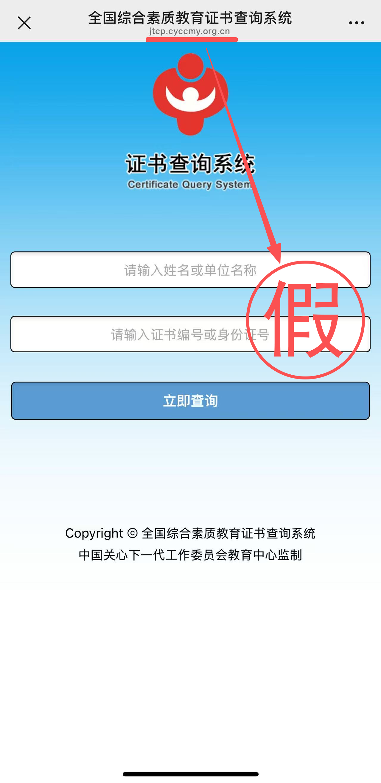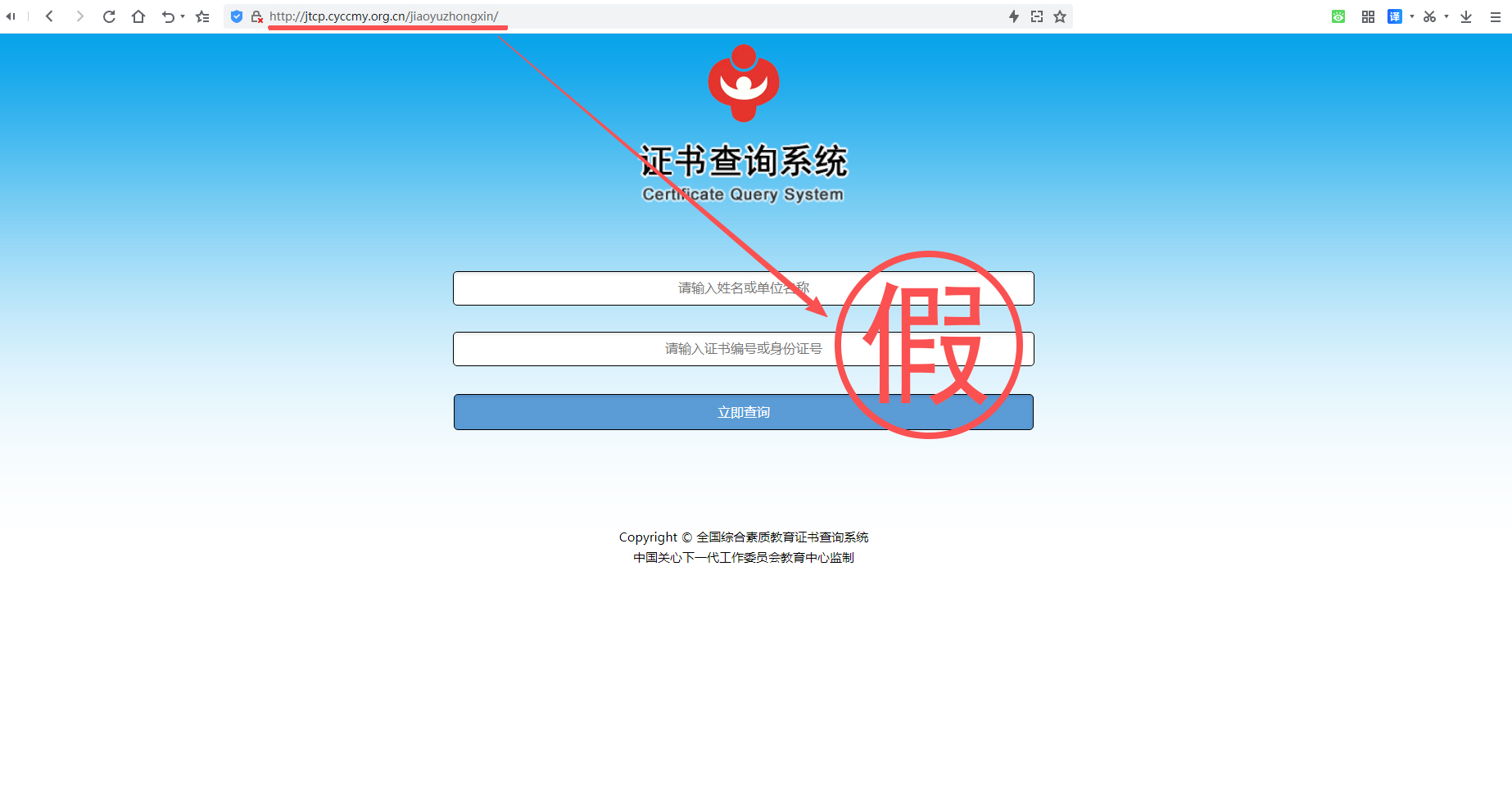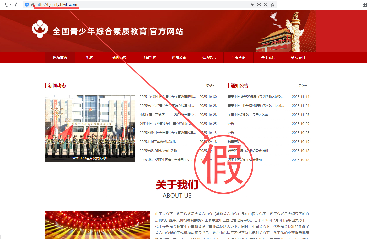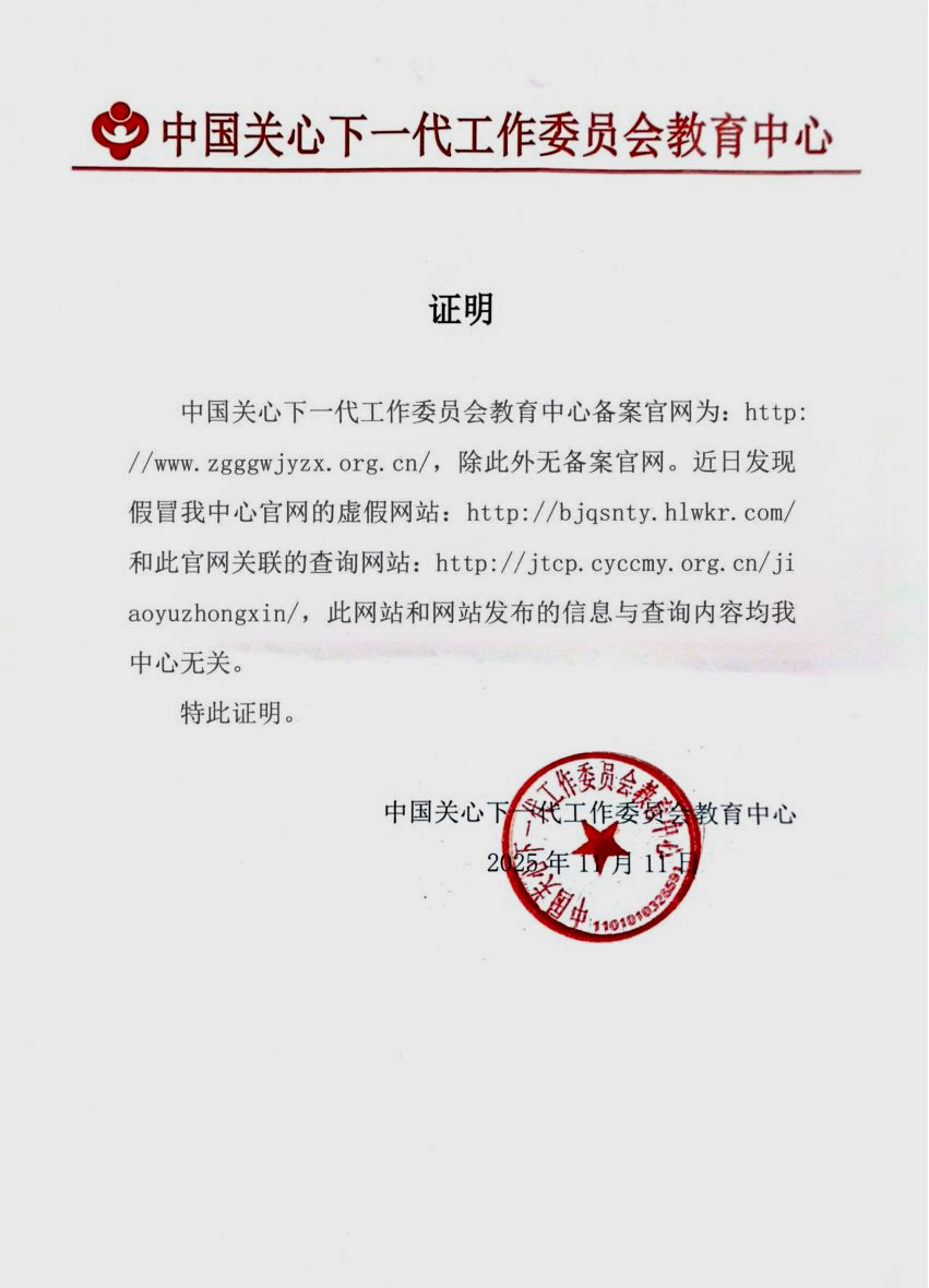 为保障广大青少年的切身利益,净化市场环境,提醒相关单位不要再轻信各种谎言,认真经营,切实保护好自身发展积攒下的市场公信力,不要一错再错。诸如 http://bjgsnty.hlwkr.com/ 及其关联查询网站 http://jtcp.cycqy.org.cn/jiaoyuzhongxin/ 等,均为非法搭建的虚假诈骗网站。其发布的所有活动信息、文件及所谓“认证”内容,均与教育中心无任何关联,教育中心对此概不负责。