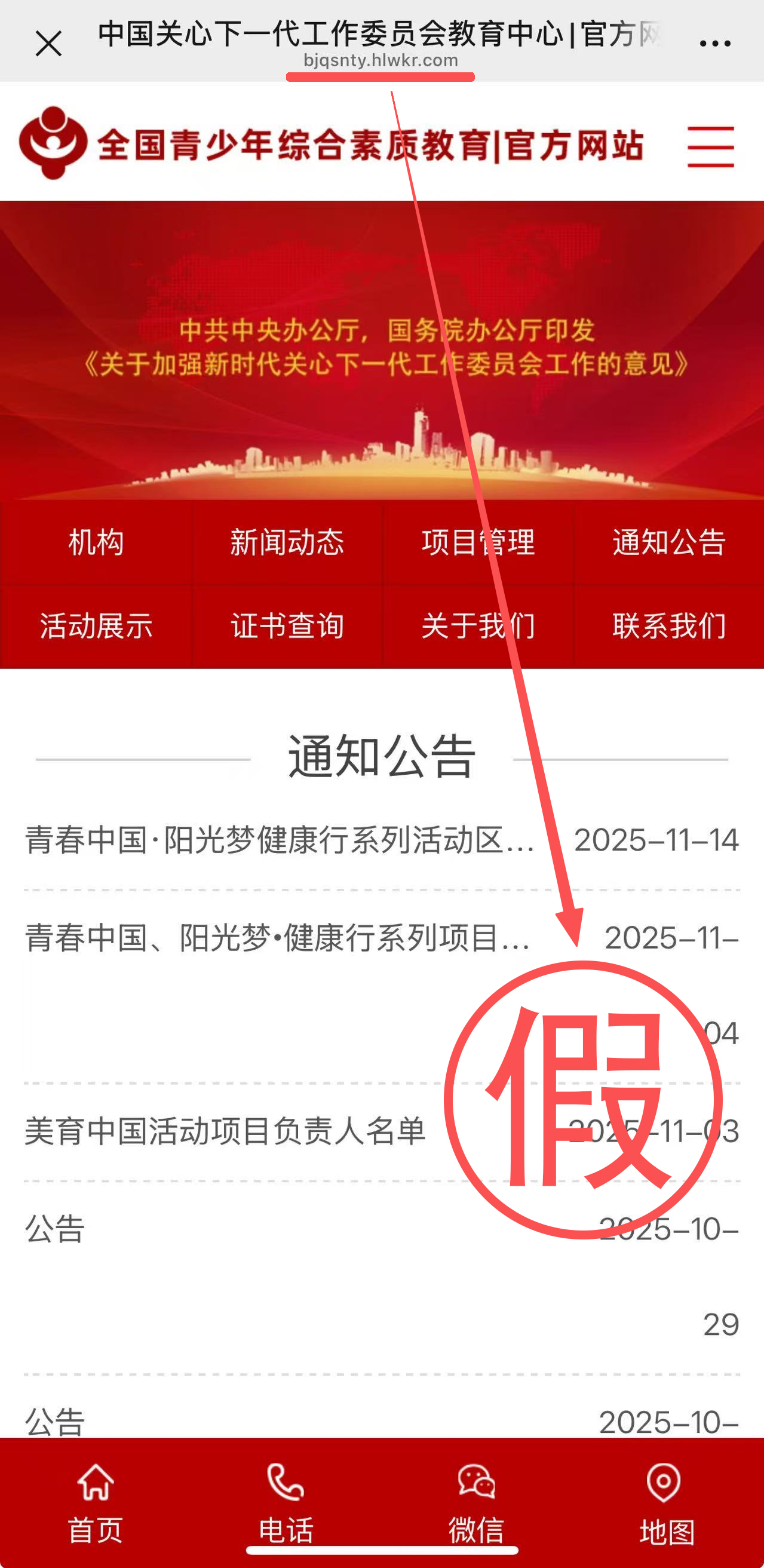我们秉持善意推定,相信多数主体并非主观恶意触碰法律红线。在此提请已发布与虚假官网相关活动信息的单位及个人,自即日起及时删除所有冒用中国关心下一代工作委员会教育中心名义的虚假活动链接,切勿直至司法程序启动(法院传票送达、公安机关传唤)时方追悔莫及。